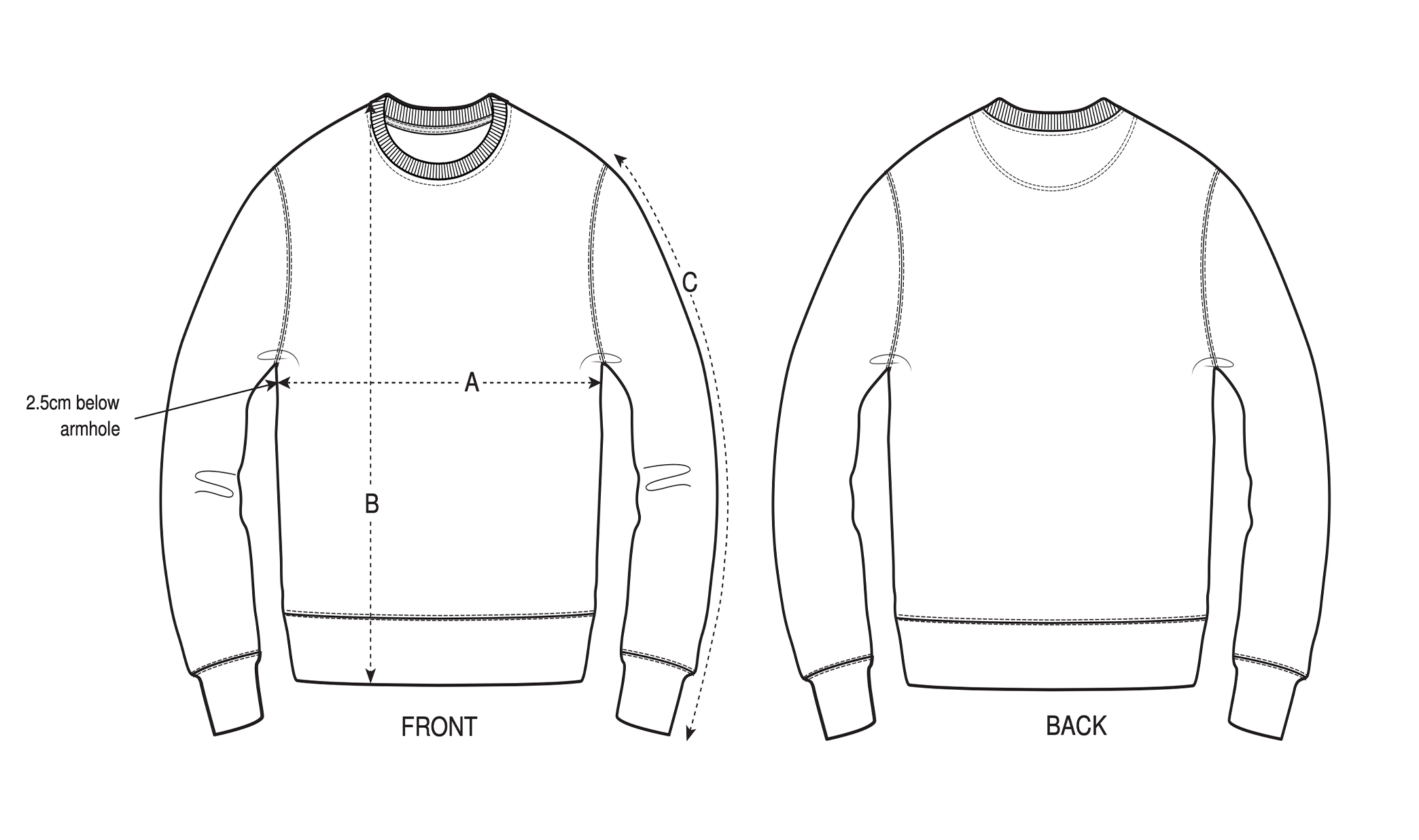 Sizes | A - Half Chest | B - Body Length | C - Sleeve Length |